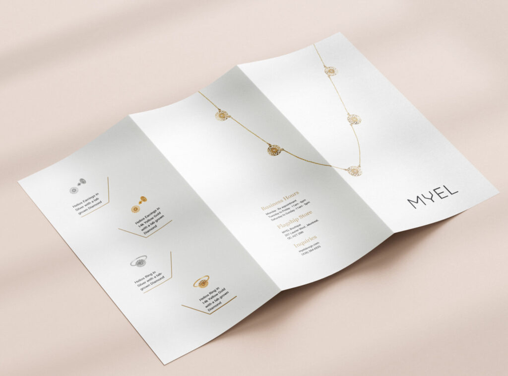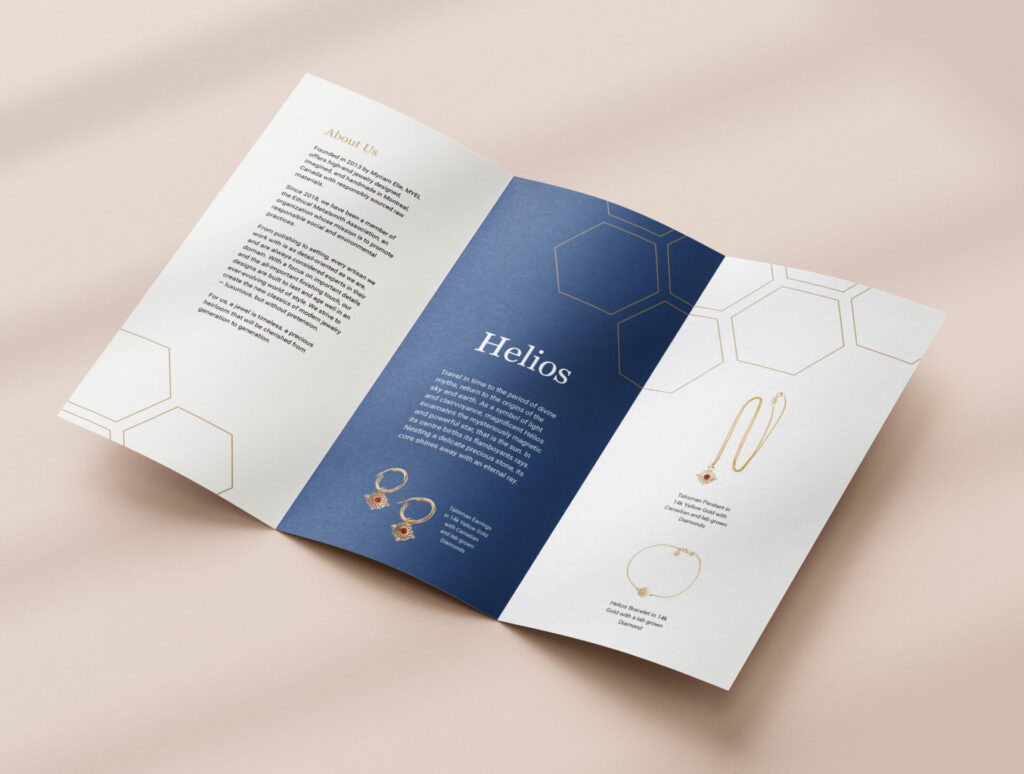 I chose a jewelry brand called MYEL and created a brochure for their company. I chose one category that I wanted to create this brochure for, which is the Helios category. I figured the jewelry is the most important and more eye-catching whether viewers are close or far, which is why I made the jewelry big on the front and back panel to attract people right away. I incorporated the company’s honeycombs from their website since that’s what makes their brand more recognized. I made the brochure as simple as possible to really show off only the jewelry, and to bring more value to the jewelry (show that it’s expensive/high quality). I used adobe InDesign and Photoshop. I also wrote the text in my own words.